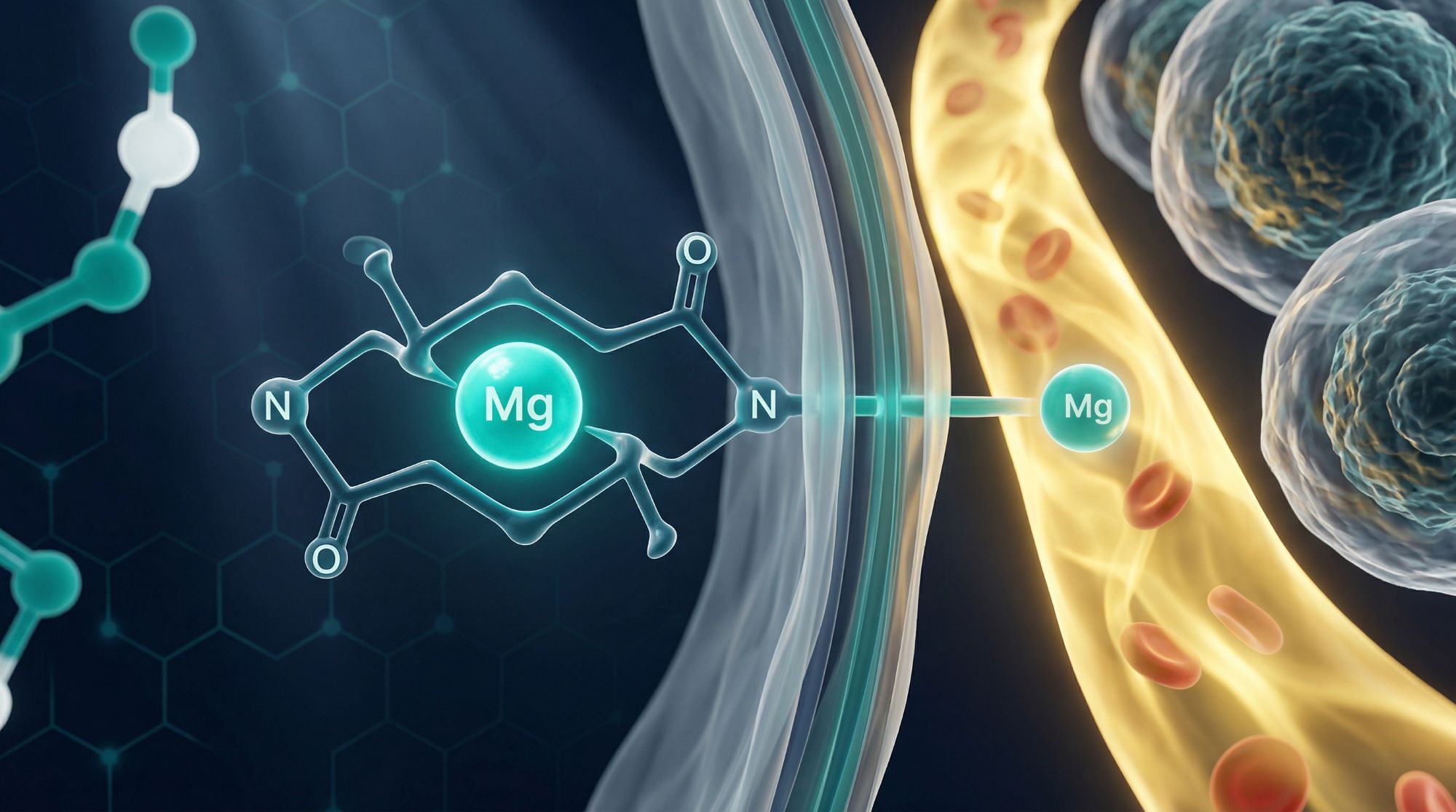Magnesium bisglycinate (bisglycinát hořečnatý) je chelátová sloučenina, v níž je atom hořčíku pevně navázán na dvě molekuly aminokyseliny glycinu. Tato chelátová vazba je klíčem k jeho výjimečným vlastnostem – díky ní se hořčík vstřebává jako aminokyselina, nikoli jako klasický minerál, čímž obchází běžné bariéry absorpce v trávicím traktu.