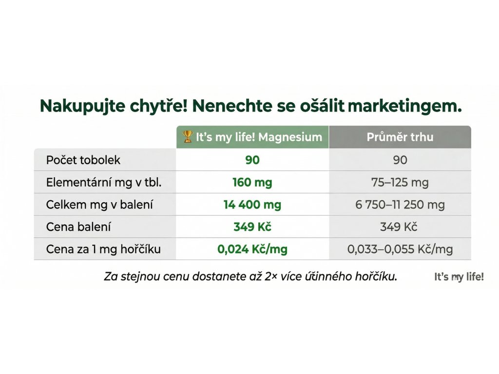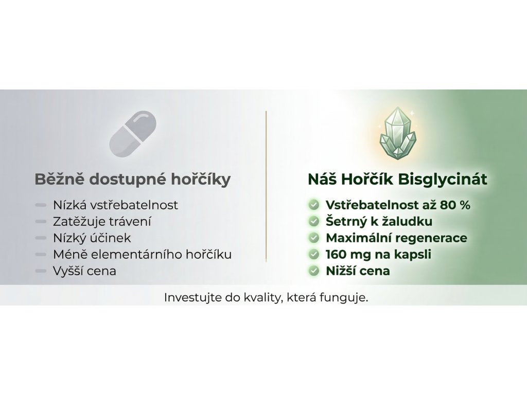 Nenechte se ošálit levným marketingem Většina levných doplňků v lékárnách používá levné zdroje hořčíků. I když etiketa slibuje vysoké hodnoty, vaše tělo z nich dokáže využít pouze zlomek (např. u oxidu hořečnětého cca 4 %). Zbytek tělem projde bez užitku a často způsobí zažívací potíže.