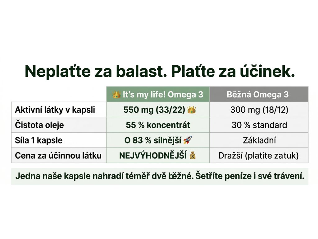 Víte, kolik EPA a DHA skutečně obsahuje váš rybí olej? Většina produktů na trhu nabízí pouhých 300 mg aktivních látek v kapsli — zbytek tvoří balastní tuk bez přínosu pro vaše zdraví. Náš Omega 3 Rybí Olej 33/22 obsahuje v denní dávce (2 kapsle) 660 mg EPA a 440 mg DHA — celkem 1 100 mg čistých omega-3 mastných kyselin. To je téměř dvojnásobek toho, co nabízí běžná konkurence. Jedna naše kapsle nahradí téměř dvě levné z lékárny. EPA a DHA přispívají k udržení normální činnosti srdce, DHA příznivě ovlivňuje funkce mozku a zraku.