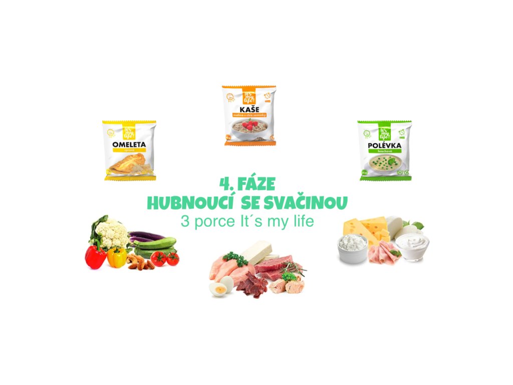 Ve čtvrté fázi budete jíst 3 sáčky denně a to na snídani, jednu ze svačin a večeři. Obědy zůstanou stejné jako ve třetím kroku, ale místo It’s my life sáčků na jednu ze svačin budete mít bílkoviny jako jsou jogurty, sýry, šunky, kefíry, Cottage apod.
