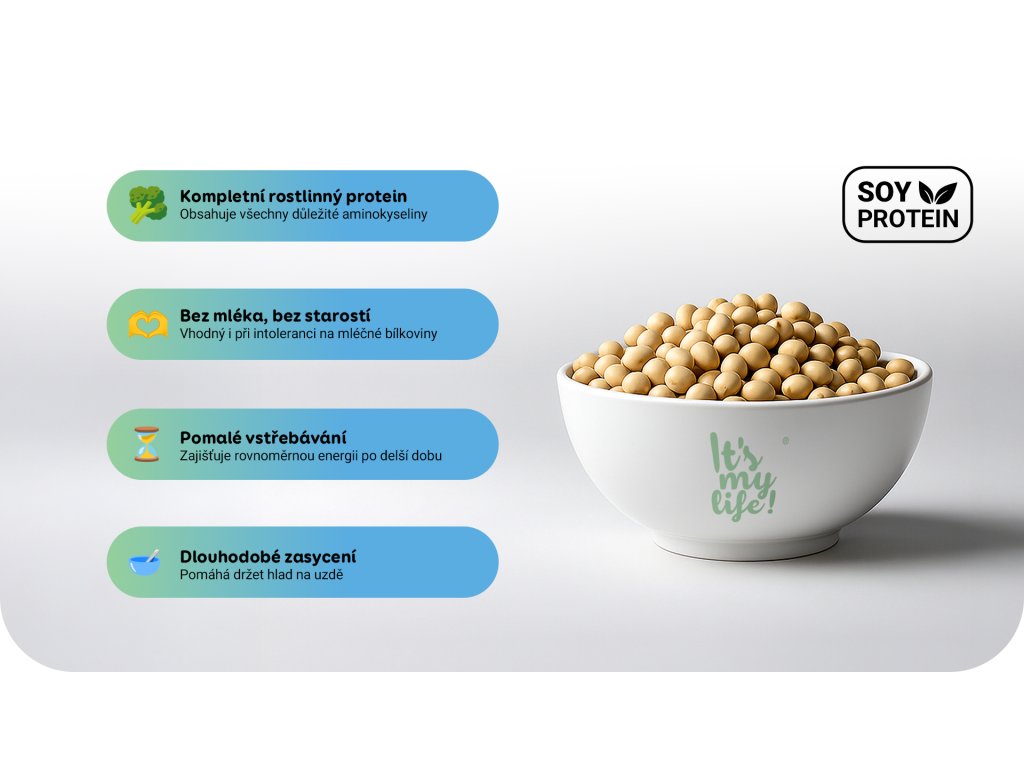 Sójový proteinový izolát - je rostlinný protein s výbornou stravitelností a vysokou nutriční hodnotou. Poskytuje všechny důležité aminokyseliny a je vhodný i pro osoby s intolerancí na mléčné bílkoviny. Díky pomalému vstřebávání pomáhá udržovat rovnoměrnou hladinu energie a zasytí na delší dobu.