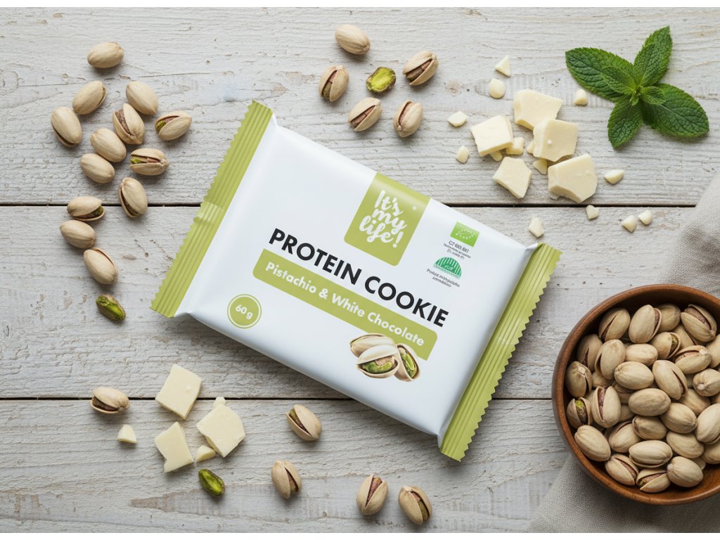 Proteinový cookie pistácie s bílou čokoládou